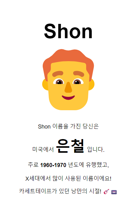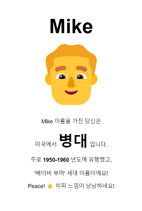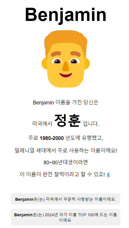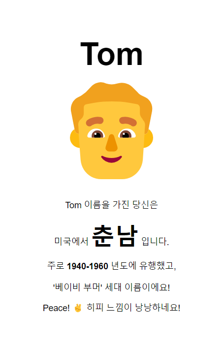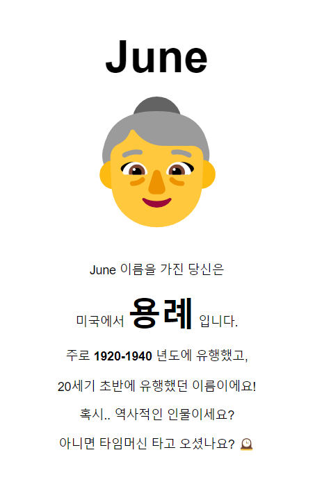 - 이름이 많이 쓰이던 시대를 대략적으로 알려주기 때문에 사용자의 나이와 비교하여 작명을 한다면 잘 어울리는 이름을 고를 수 있습니다.