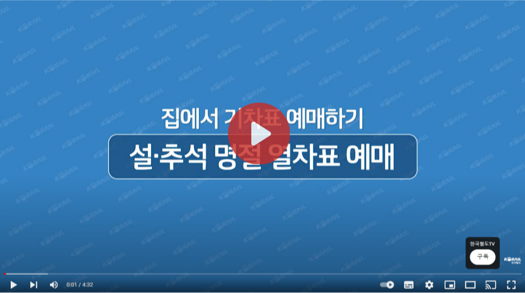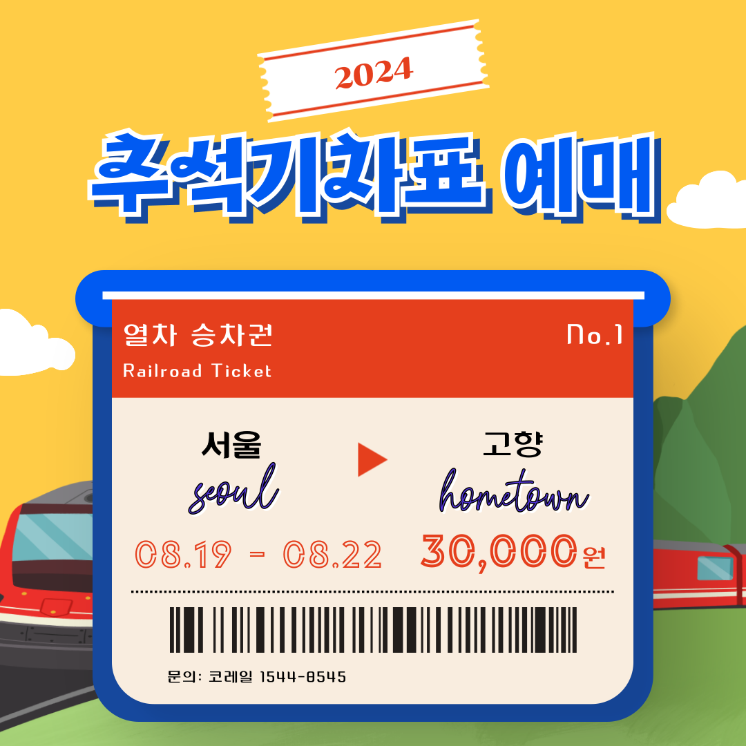 2024년 추석 기차표 예매가 오는 8월 19일부터 22일까지 온라인과 고객센터(전화)를 통해 이루어집니다. 대상기간은 24.09.13(금) ~ 24.09.17(화, 추석) ~ 24.09 18(수), 6일간이며 무궁화호 이상(관광열차 포함) 열차승차권에 한해서입니다.