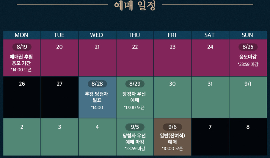 현재는 우선 예매권 추점제 방식은 기한이 종료되었으므로 9월 6일에 오픈하는 일반 예매(잔여석 예매)가 가능합니다.