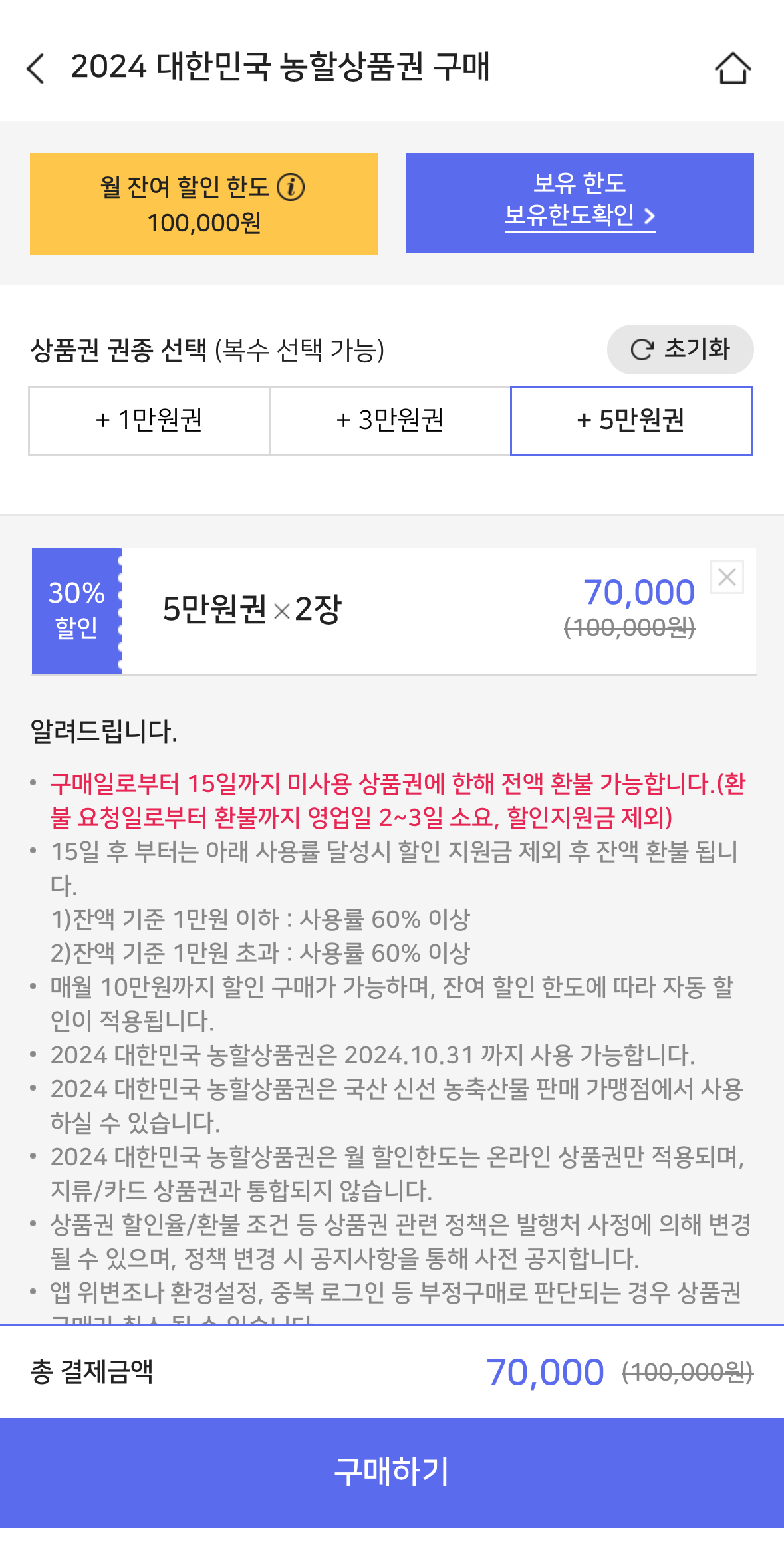 - 할인 혜택 : 농할상품권은 최대 30% 할인 혜택을 제공합니다. 1인당 월 최대 10만 원까지 구입 가능하며, 이는 소비자에게 경제적인 장점을 줍니다.