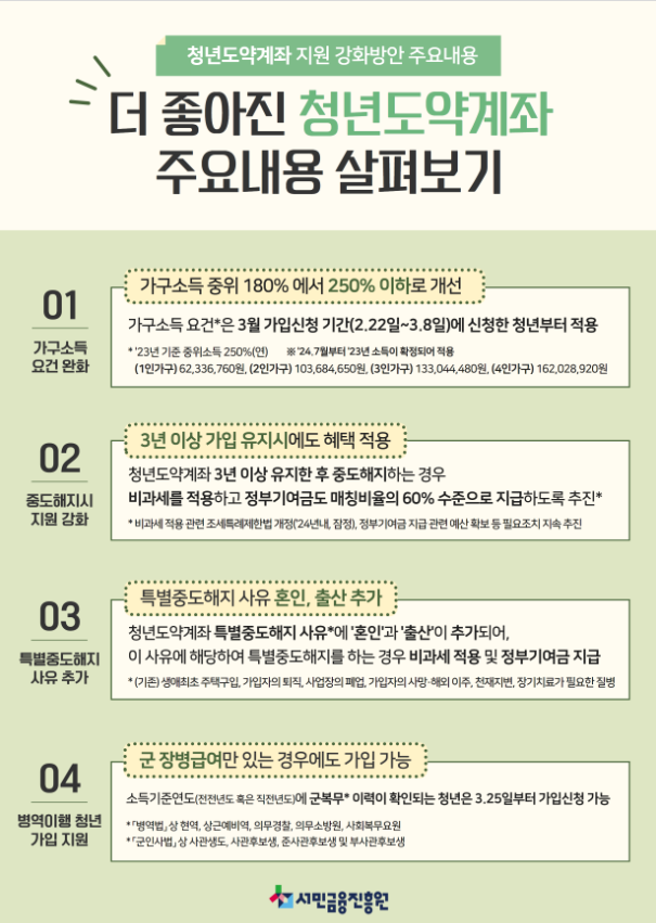청년도약계좌는 저축을 통해 자산을 형성하고 경제적 자립을 이루고자 하는 청년을 위한 특별한 금융상품입니다. 청년도약계좌의 가입혜택이 앞으로 더 강화됩니다. 가입자는 소득 구간에 따라 최고 연 9.54% 일반 적금에 가입한 것 과 같은 효과를 누릴 수 게 됩니다. 아직 개선안이 시행되진 않았지만 소득이 높아질수록 받을 수 있는 혜택이 줄어들기 때문에 가입 시기는 빠르면 빠를수록 좋습니다. 청년도약계좌 10월 신청기간 놓치지말고 지금 바로 신청해 보세요.